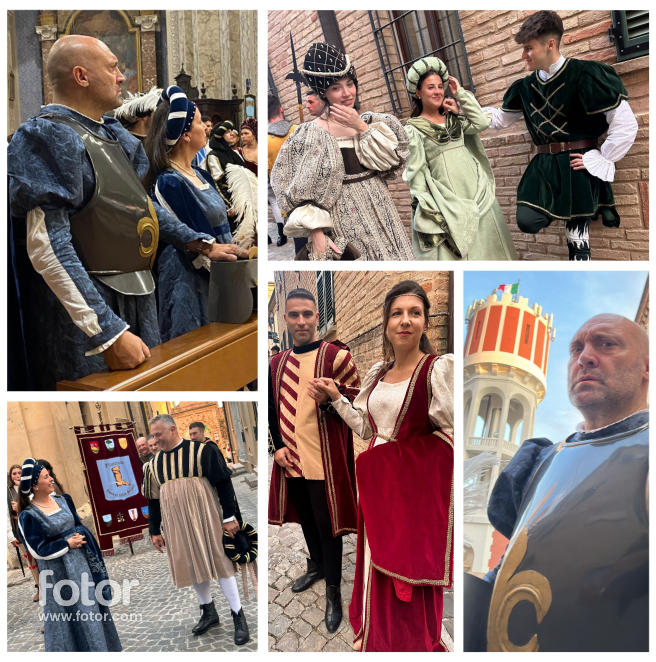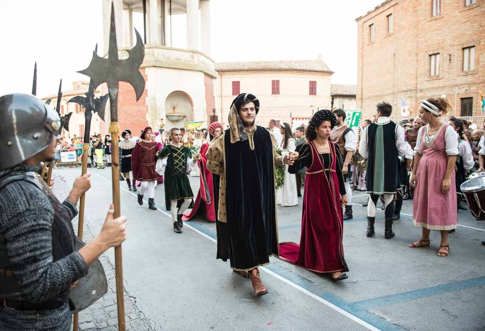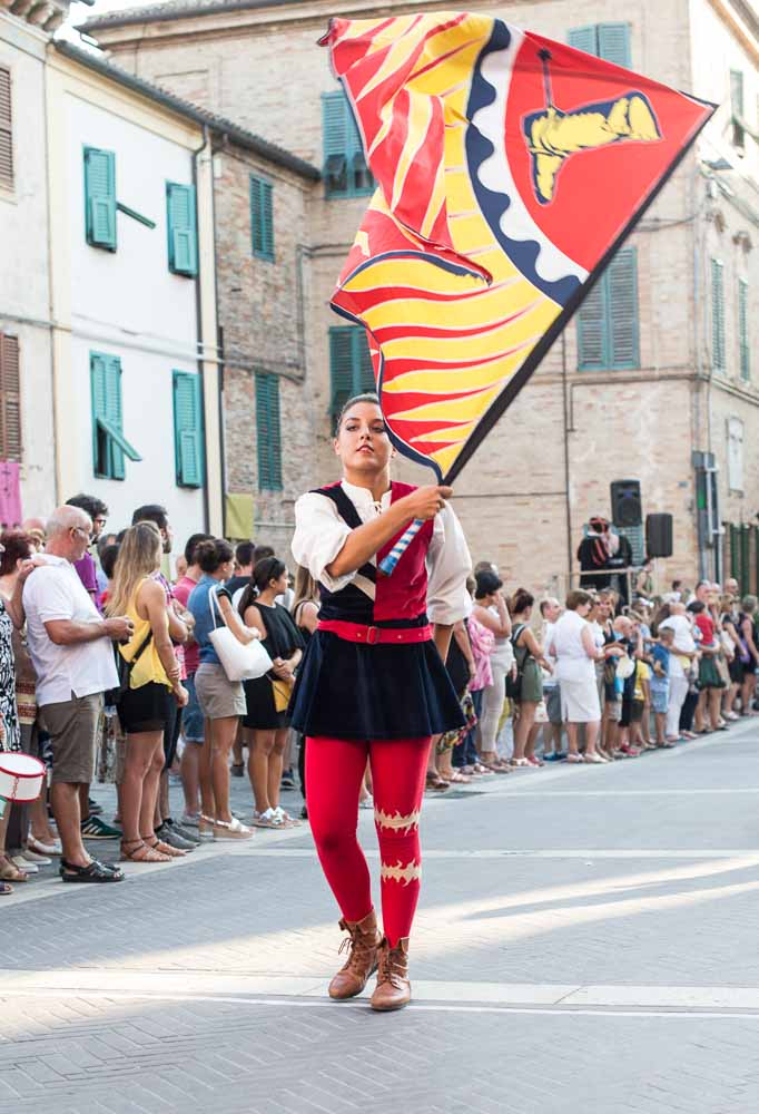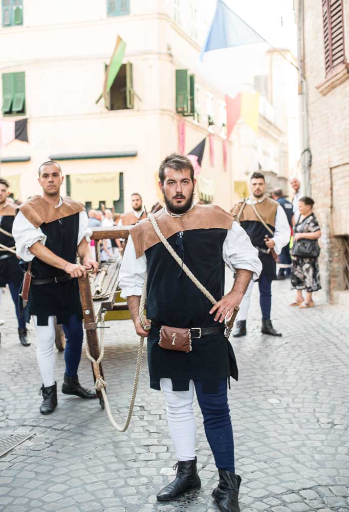 Dame e cavalieri, popolane e signori, donzelle e paggi, militari e dignitari debbono molto ai costumi di Tina Tittarelli se per un meriggio d’estate riescono ad evadere dalla vita di tutti i giorni sentendosi attori in un set quasi cinematografico che in ogni edizione diviene una riscoperta. Anche il prendere coscienza che quella fierezza assunta in ogni “contesa” non sia di posa ma autentica perchè derivante da un illustre passato, fatto di morti e di risurrezioni, è l’elemento principale per la gente per continuare a sorprendere l’ammirazione degli spettatori che salgono sul castello. Il Gonfalone e le insegne osimani nonchè le sue scorte s’incardinano nel corteo storico, a vista controllati dagli alabardieri e cannonieri, che li precedono e dagli armigeri ed arcieri di San Michele che li seguono.