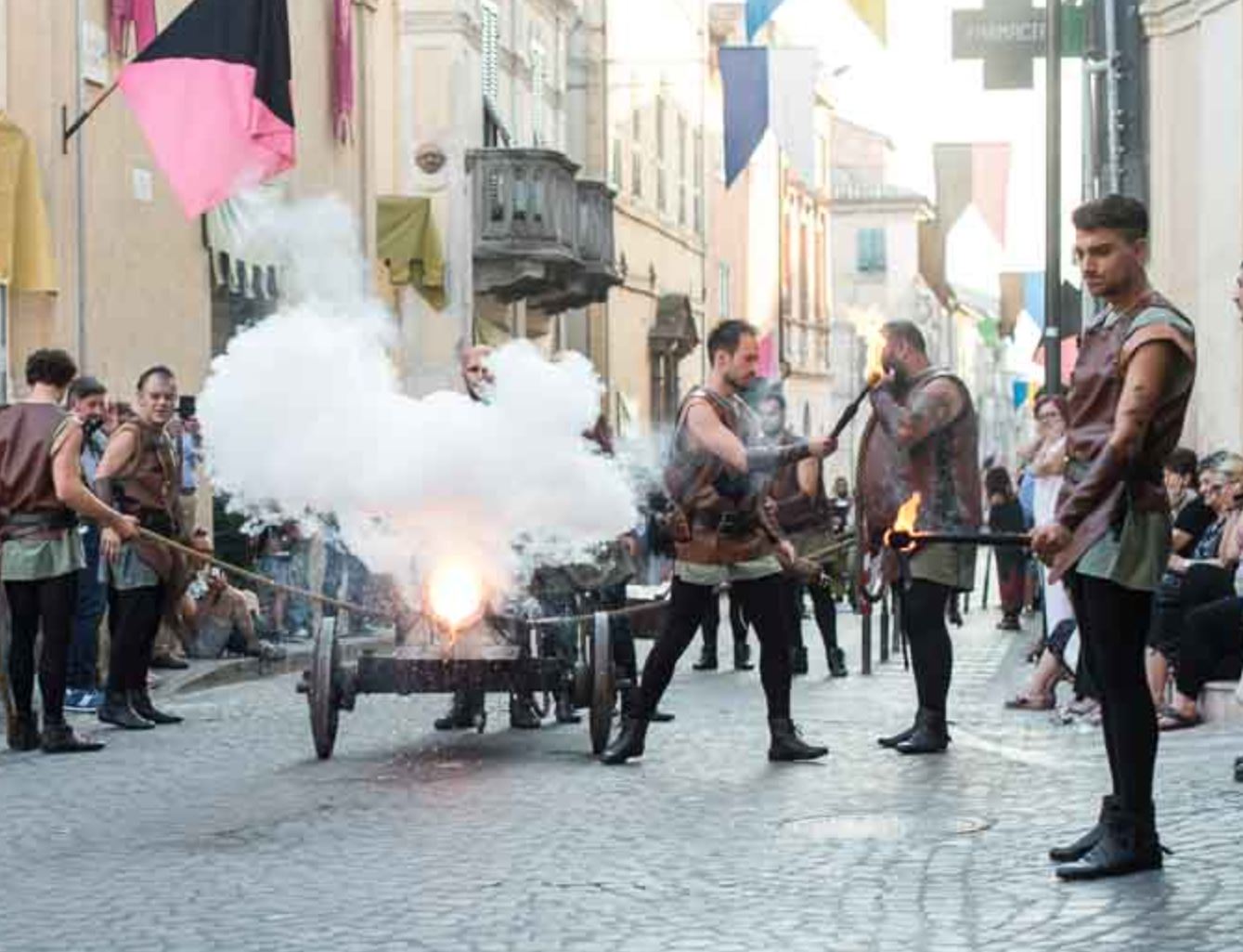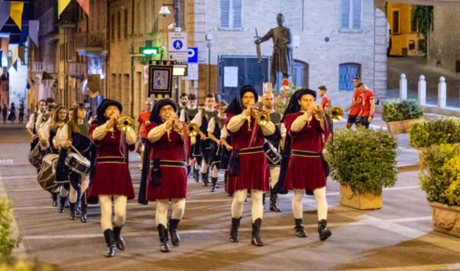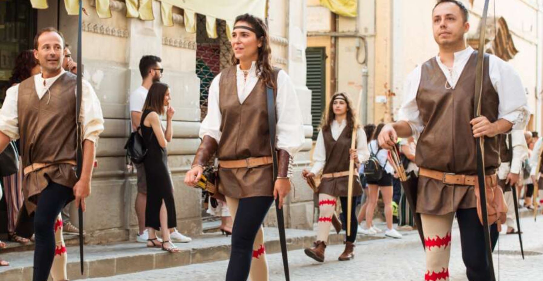 Corteo Storico: Un imponente corteo con oltre 500 figuranti in costume che sfilano per le vie del centro storico, accompagnati da suonatori di chiarina e tamburi, sbandieratori, e rappresentanti delle contrade e delle città gemellate.